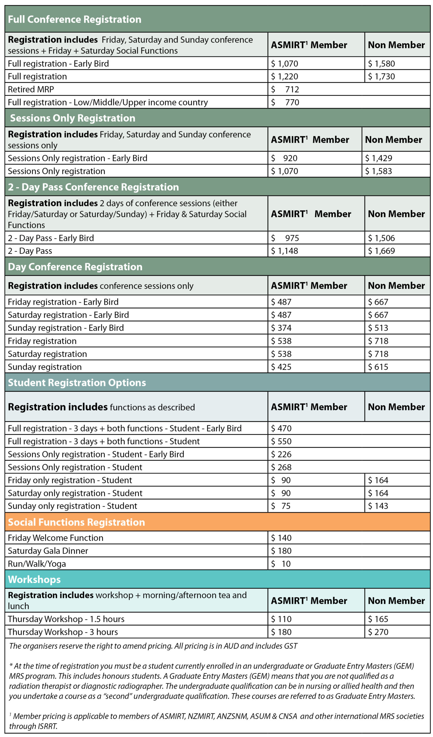 Member pricing is applicable to members of ASMIRT, NZSMIRT, ANZSNM, ASUM, CNSA & MINA and other international MRS societies through ISRRT.