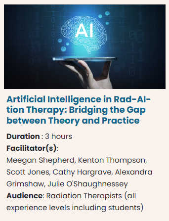 This workshop is designed to equip participants with both theoretical knowledge and practical insights into the application of artificial intelligence (AI) in radiation therapy (RT). Led by local and international AI experts, the program will feature real-world case studies showcasing the clinical use of AI in RT settings. Key topics will include the evolving role of AI in RT practice, its implications for education and workforce development, safe implementation strategies, quality assurance, and governance frameworks. Participants will explore how AI can enhance workflow efficiency, enable automation, and drive innovation in RT. The workshop will feature interactive, case-based discussions, Q&A sessions, and provide actionable knowledge to support and improve the everyday practice of Radiation Therapists.