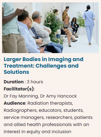 This interactive workshop explores the challenges and opportunities when treating/imaging patients with larger bodies, drawing on recent research findings. Using a fishbowl discussion format, participants will explore problem statements grounded in real-world practice. Small group brainstorming, structured by implementation frameworks (such as Consolidated framework for Implementation Research, CFIR), will generate practical solutions and strategies for clinical practice, education, and service delivery. By combining research evidence with collective expertise, the session aims to move beyond discussion and towards actionable insights. Participants will leave with a clearer understanding of both the barriers and feasible solutions to improve inclusivity and patient-centred care.